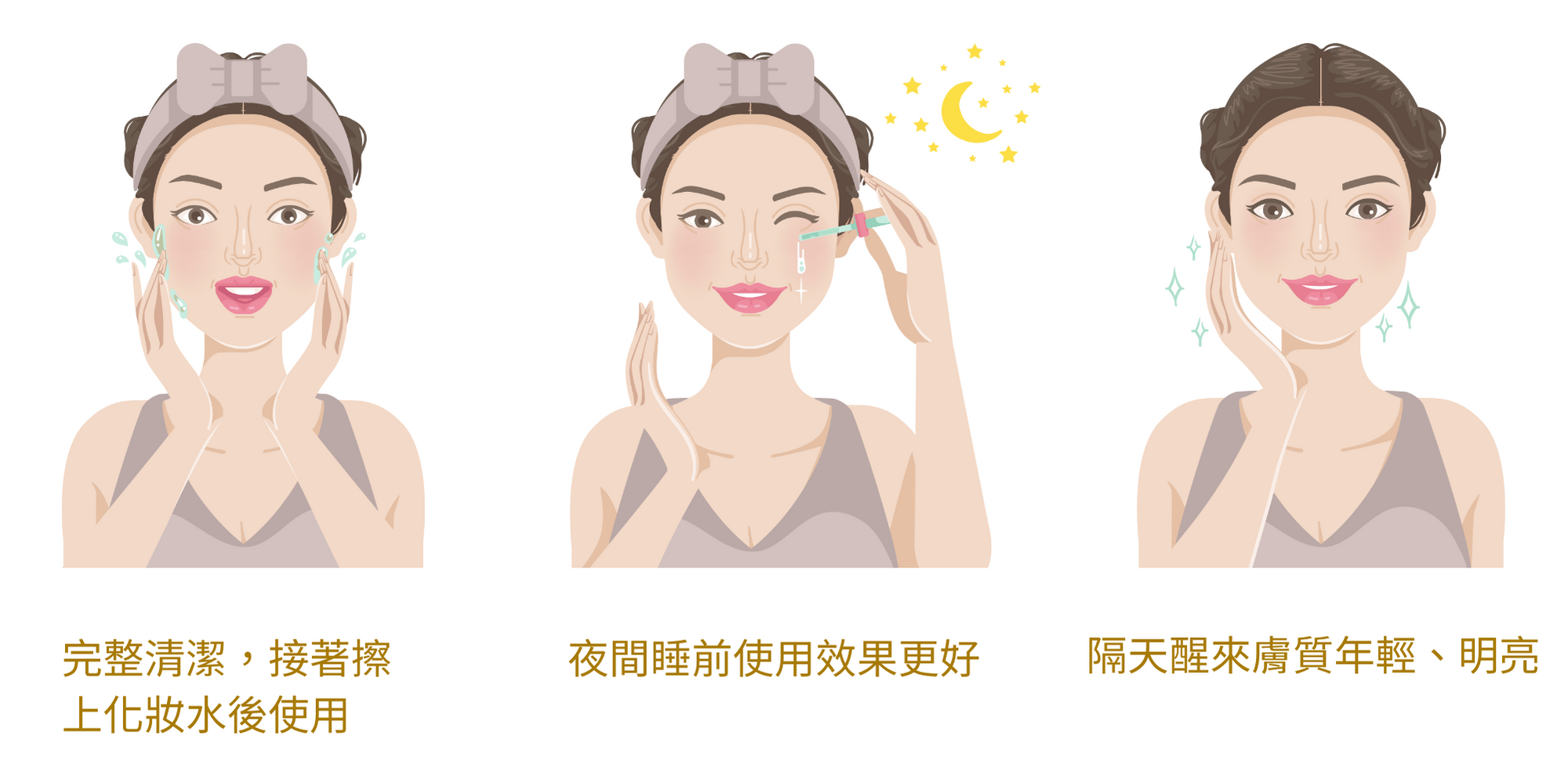 白天、晚上皆可使用,可以在每次使用化妝水之後使用,尤其在晚上使用時皮膚在睡眠中會自我修復和再生,搭配紅色奇激精華液具有抗氧化及修復等成分會有更好的效果,每次使用完隔天肌膚都會亮一個色階。