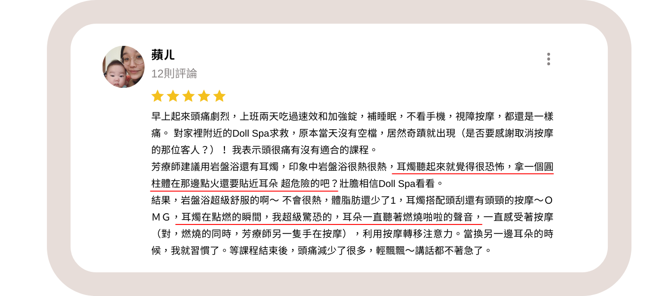 我的工作是產品行銷規劃及視覺設計!靈感與專案開發上,不停燒腦思考,隨著越來越多工作量,好幾次腦袋感覺有些暈,頭會有很脹或偏頭痛的狀況。 每一週固定去逗Dollspa放鬆!店長安排療程,很溫柔詢問有哪裡不舒服,我把下班後頭暈症狀跟店長說! 店長推薦耳燭! 整個過程非常放鬆,按摩從胸口做到耳後,蠟燭在耳朵旁,聽見耳朵帶出來的水氣與火焰後,發出的特別的「滋滋聲」,不知不覺就睡著了,整個過程非常舒服,讓疲累的我慢慢放鬆。 完成耳燭之後,感到輕鬆,眼睛跟耳朵都有一種清晰的感覺,腦袋不漲頭不暈,最神奇臉部的線條更尖! 很有趣的插曲,洗澡時整個人都很輕盈,開始有思緒的時候,就是已經洗好準備穿上衣服,原來真的需要讓自己放空! 做完耳燭有種很放鬆的心情,還有一種感覺「煩惱是不是都被一起跟著蠟燭給燒掉了呢」!(哈哈)