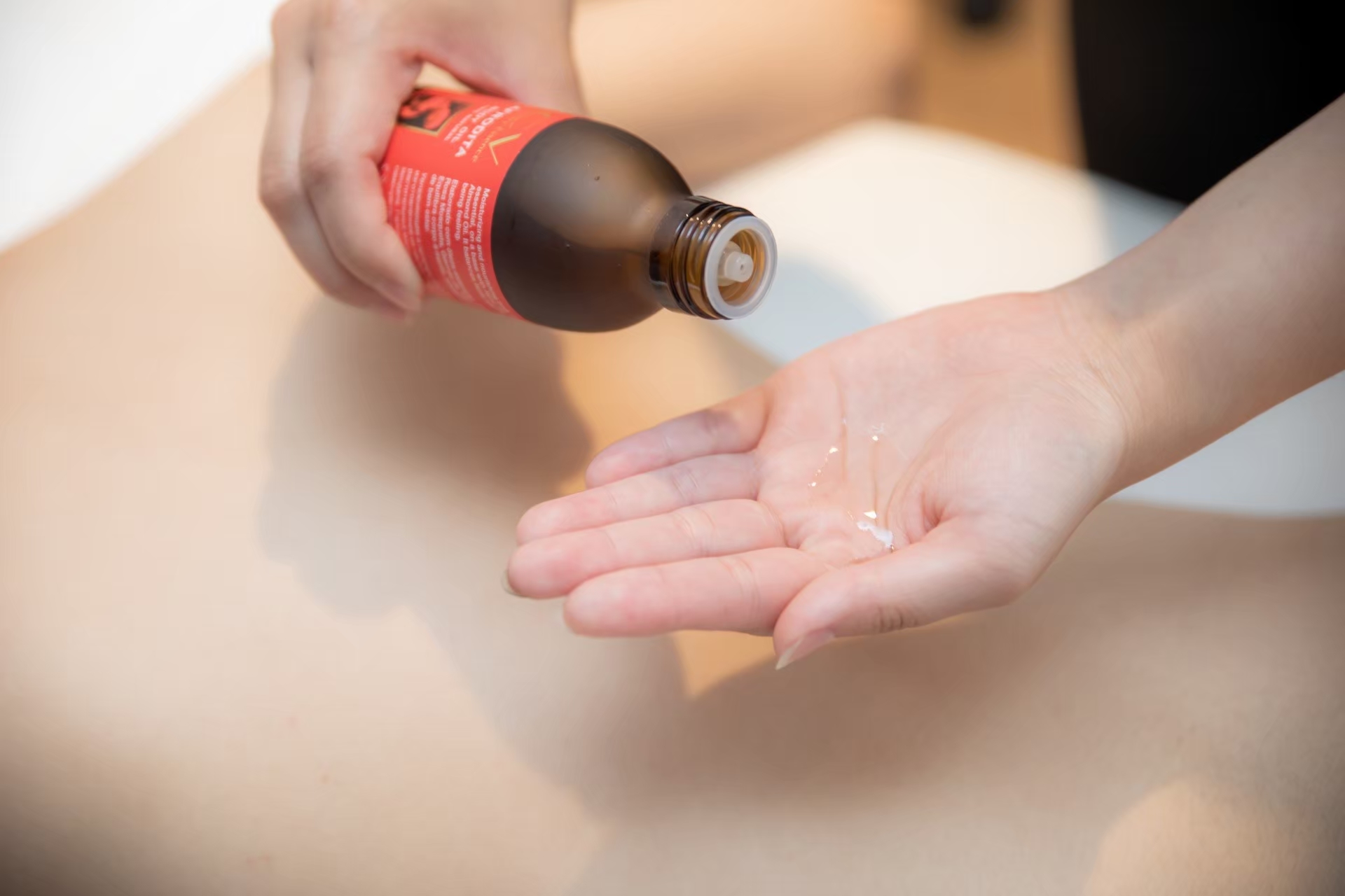 課程中使用玫瑰歡悅精油搭配舒壓按摩手法,舒緩胸腹腔肌肉緊繃,展現女性溫暖柔美的力量,不但放鬆身心束縛,更能滋養肌膚,按摩完全身香噴噴,是完美提高回頭率的女王香氣。