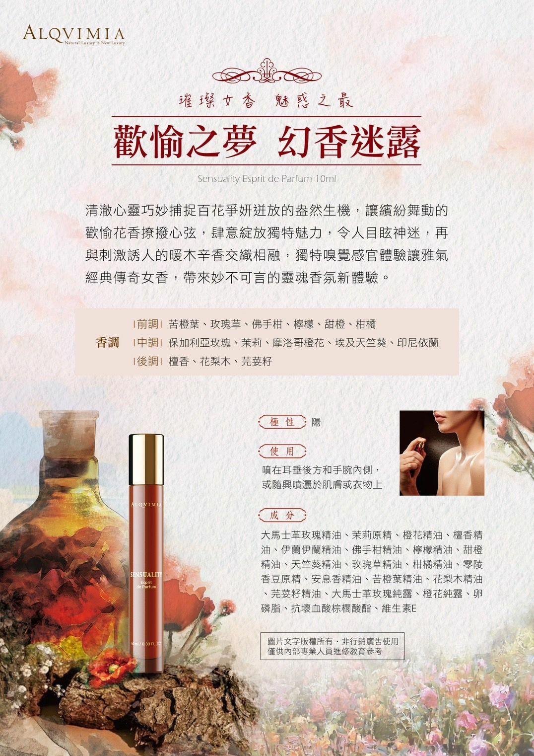 主要成分:大馬士革玫瑰精油、茉莉原精、橙花精油、檀香精油、伊蘭伊蘭精油、佛手柑精油、檸檬精油、甜橙精油、天竺葵精油、玫瑰草精油、柑橘精油、