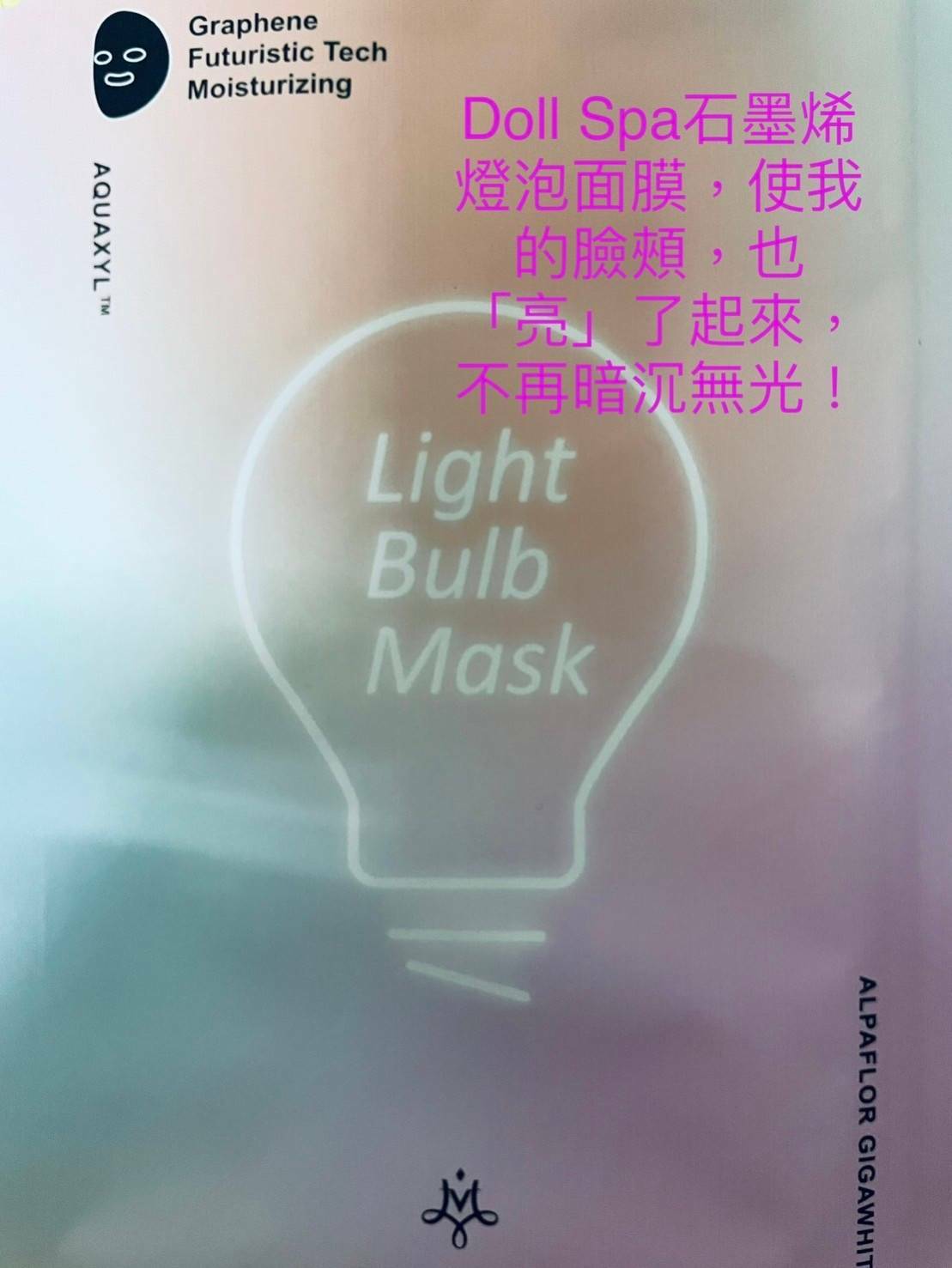 可以看到Doll Spa石墨烯燈泡面膜使用的是六角蜂巢格子織法,會讓面膜完全貼覆於臉部皮膚,親膚性很好,因此能讓精華可以完完整整的被皮膚吸收!Doll Spa石墨烯燈泡面膜能淨化膚質,使得皮膚立即變得明亮,保濕力也提升了,讓肌膚散發白裏透紅的光釆,難怪取名為「燈泡面膜」!