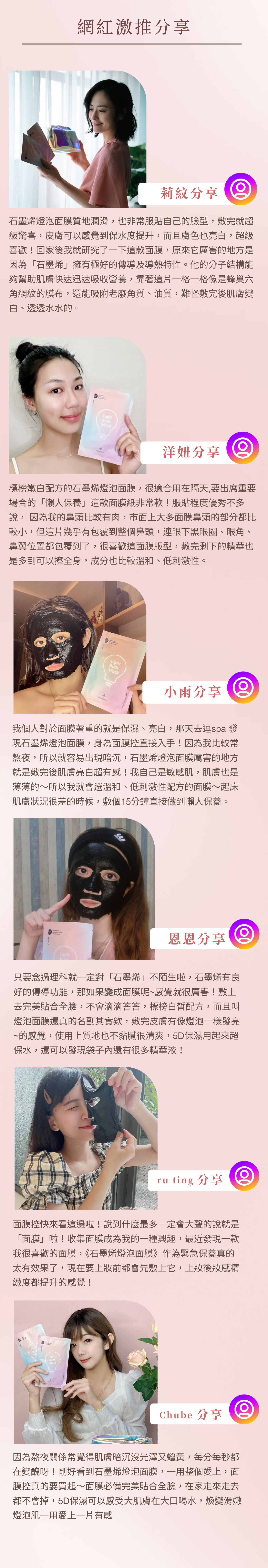 第一次敷石墨烯面膜,感覺很特別,之前也敷過黑色的面膜,但也什麼特別的感覺,光是面膜上的蜂巢格紋就覺得好酷,敷完臉白一階,美容師跟我說這個面膜有導出毛孔髒汙的效果,我敷完真的認真看了一下毛孔,真的變小了,而且不像一般調理面膜那樣水份好像補不夠,敷完臉水水的,隔天臉更亮,上妝時妝感更服貼,真的很厲害。