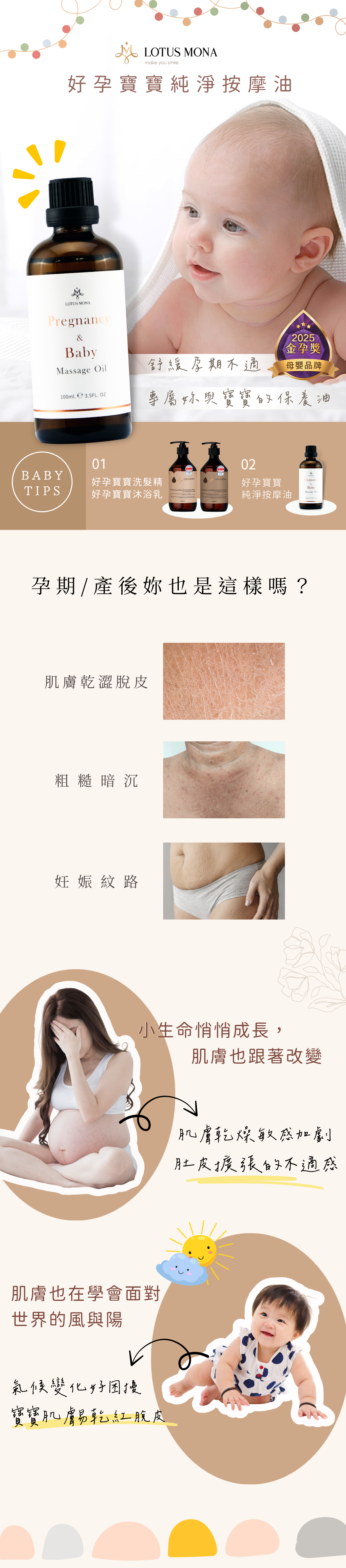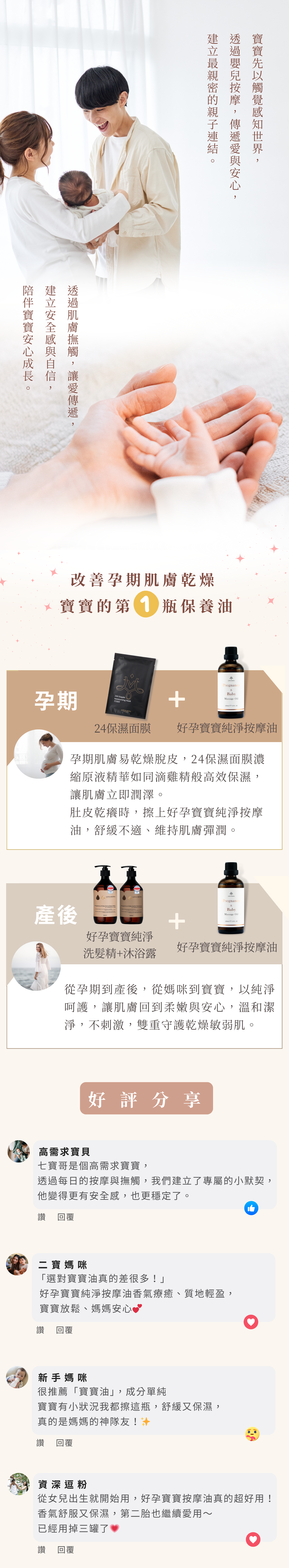 孕期就在逗spa這邊做孕婦按摩,也因為這樣接觸到她們的好孕寶寶油,在逗spa做孕婦按摩的時候使用到這個精油覺得成份非常好,也很適合孕婦,油推起來的延展性很好,香味舒服,很能放鬆身心靈~買了一罐回家早晚使用,我是全身擦完之後會在特別加強肚皮的部分,油非常好吸收,也不會黏膩,不知道是不是因為非常勤勞的在擦,肚肚保持的非常完美~棒棒的!現在也常拿它來幫寶寶做放鬆按摩,通常是洗完澡的睡前,寶寶會非常好睡,也能增加寶寶跟媽媽之間的親密感唷~因為我常幫寶寶按摩,所以我的寶寶在2個月左右就成功睡過夜了~