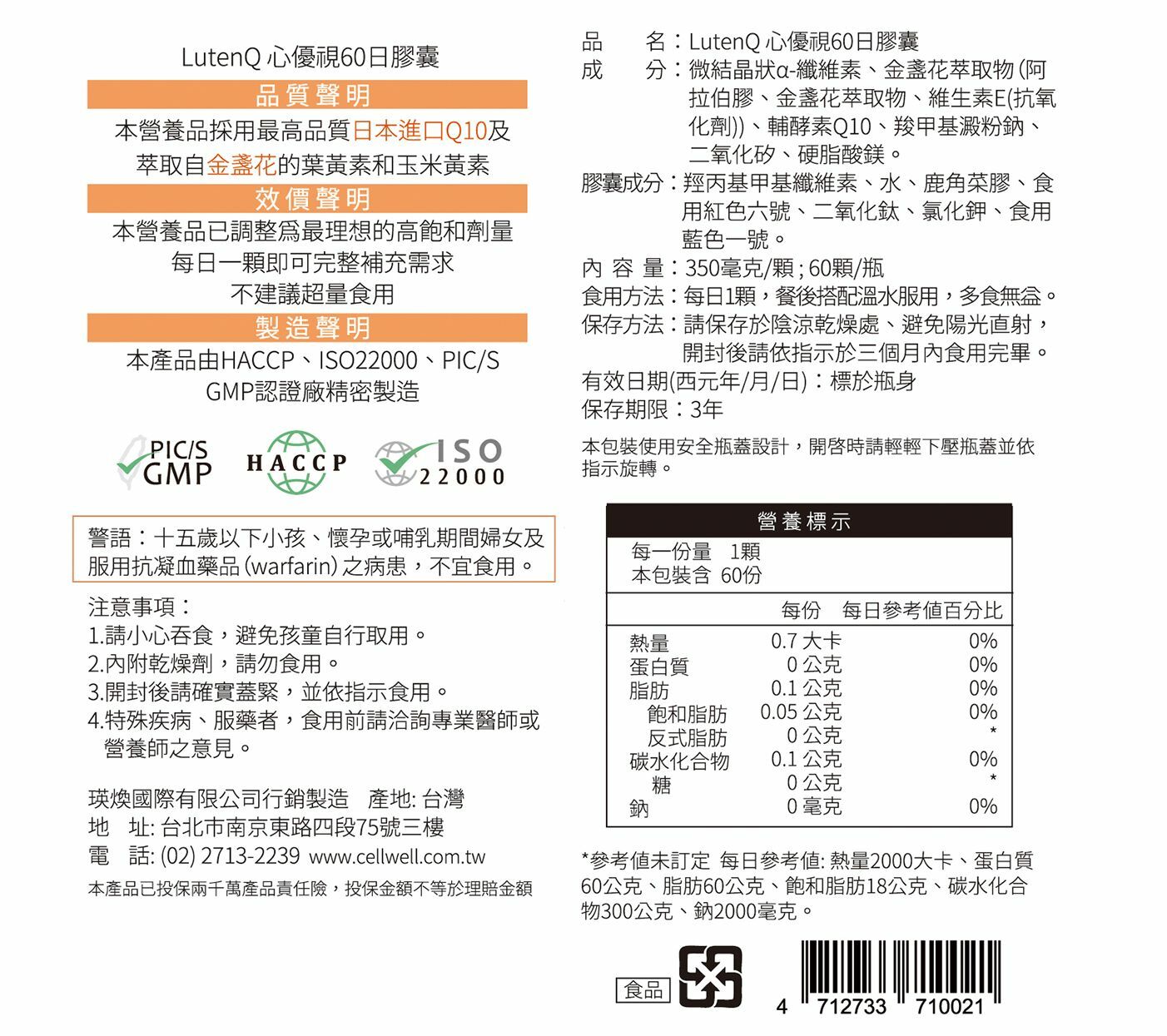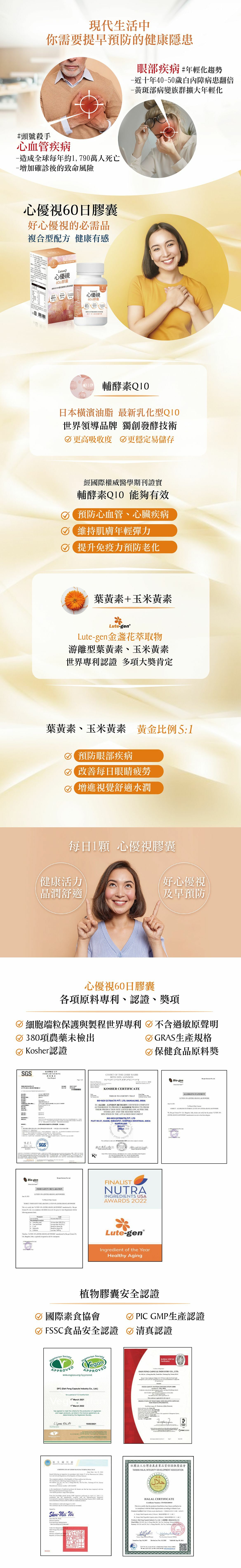 主要成分:輔酵素Q10 25mg、葉黃素 20mg、玉米黃素 4mg