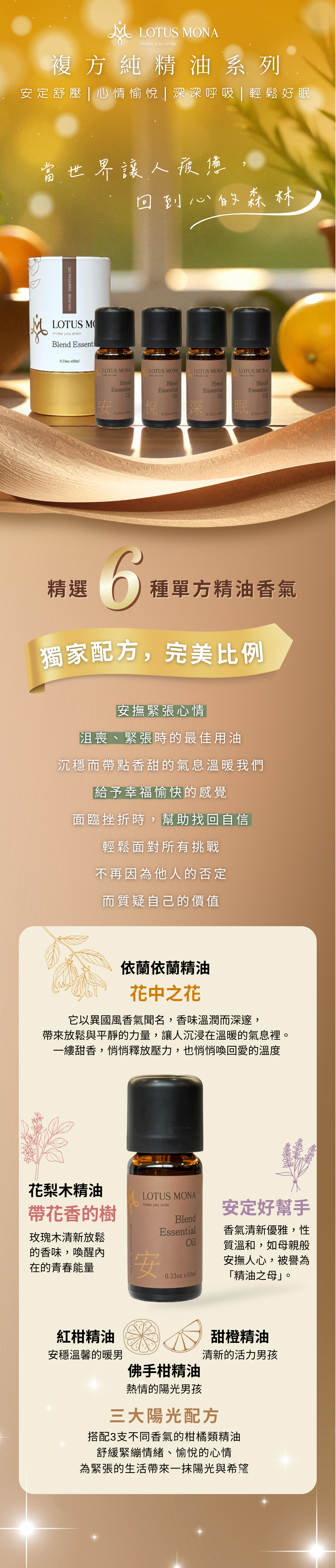 主要成分:甜橙、紅柑、薰衣草、花梨木、佛手柑、依蘭依蘭