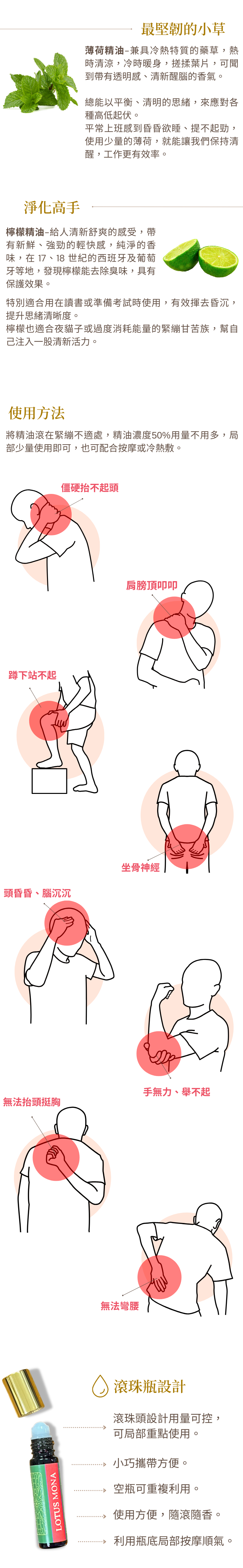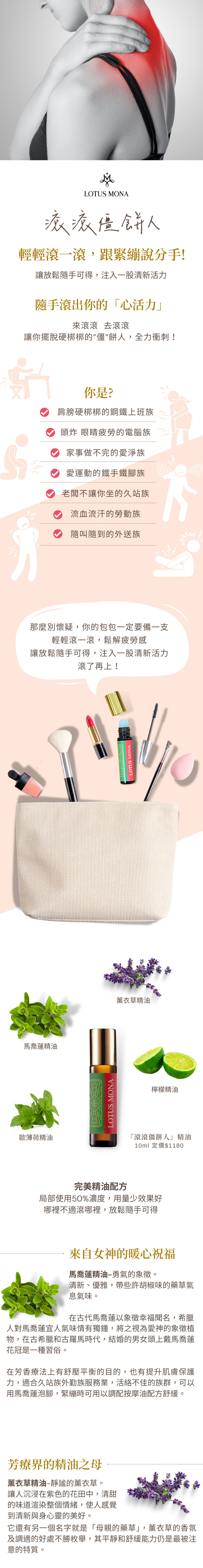 主要成分:馬喬蓮精油、歐薄荷精油、檸檬精油、薰衣草精油、荷荷芭、維他命E油