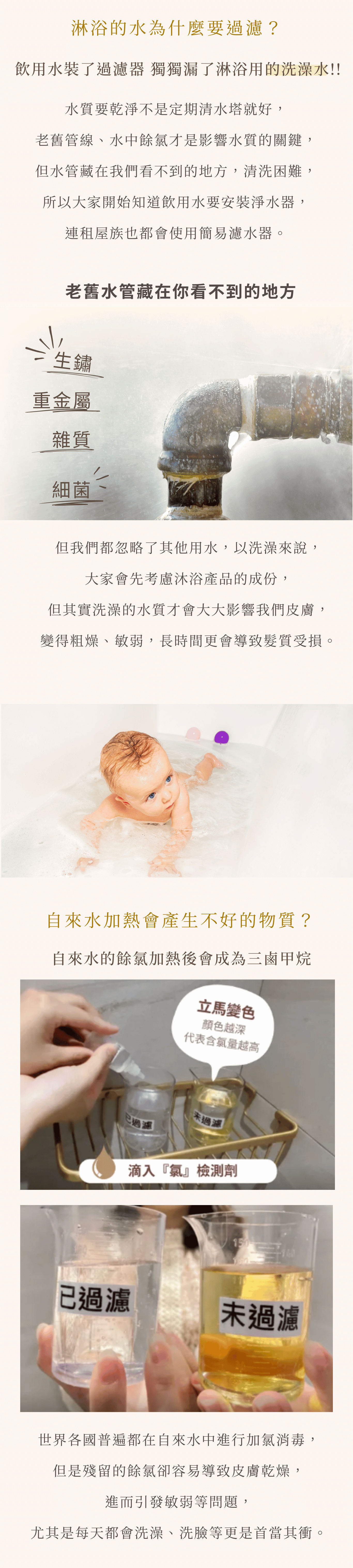 第一次到店裡看到蓮蓬頭上裝過濾器覺得很新鮮,於是就問老師們為什麼要加裝,老師們說可以過濾水中的重金屬成分,於是有幾次在洗澡就來測試看看,想說真的有這麼神奇嗎?結果真的欸!洗澡同時有香氛味,而且肌膚感覺變嫩,連髮質都不會乾澀,瞬間覺得太神奇!認真推薦每個人家中都要有裝過濾器,尤其沒有定期清理水塔,平常洗澡水真的不會很乾淨,洗澡是每天的,所以很推薦大家使用膠原蛋白過濾器。