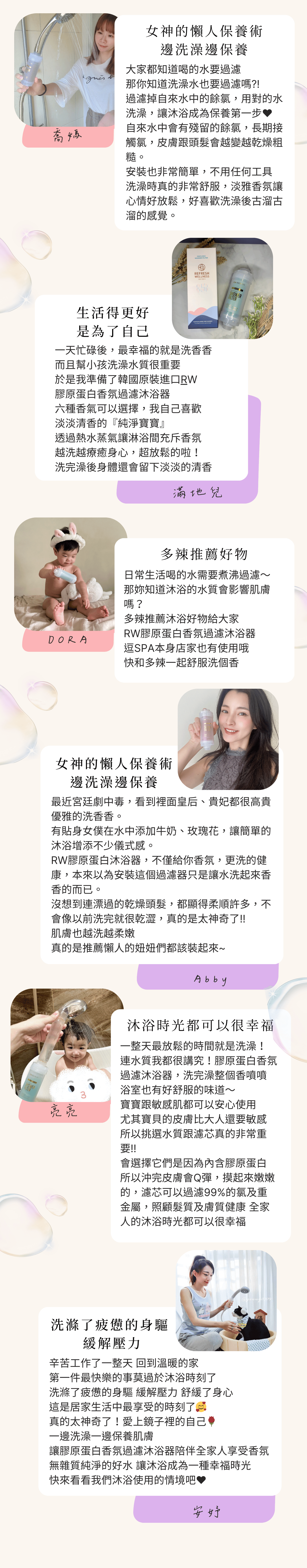 澡安,你今天沐癒了嗎?在家使用一般蓮蓬頭洗澡之後,要擦乳液才不會太乾,裝了沐浴器洗澡,每天聞不同的味道心情很好很放鬆,尤其是玫瑰和寶寶的味道我私心最喜歡,洗完澡偶爾偷懶不擦乳液也不會特別癢不舒服。