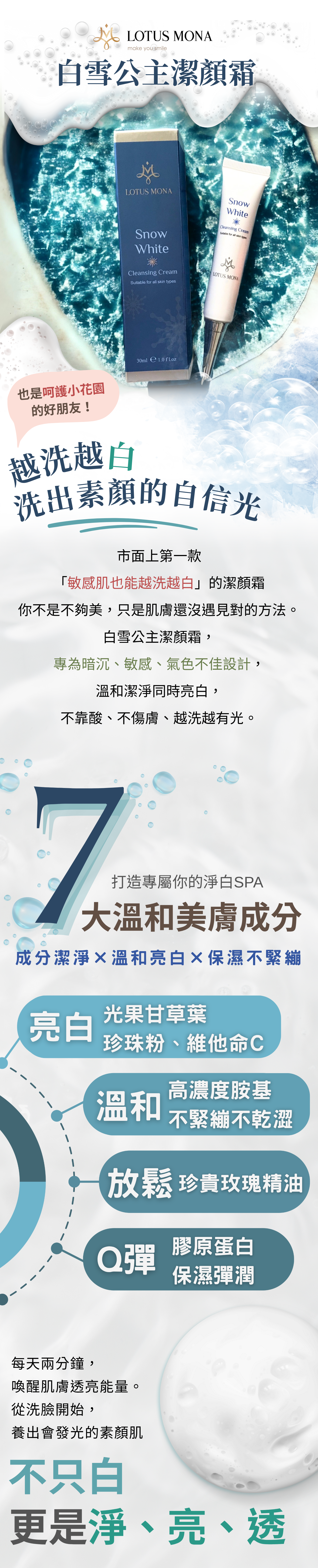 清潔是保養最重要的環節,第一次使用白雪公主時就愛上它!尤其在這季節交替時皮膚狀況很敏感!!不小心就開始紅,但每次用使用,綿密的泡泡不會摩擦自己的肌膚!洗完臉上的保水度很高臉變超亮的!喜歡變亮的原因之外還有它很溫和!溫和到連私密處都可以用,女生最容易有私密處感染的問題 ,有了他這些都不是問題!