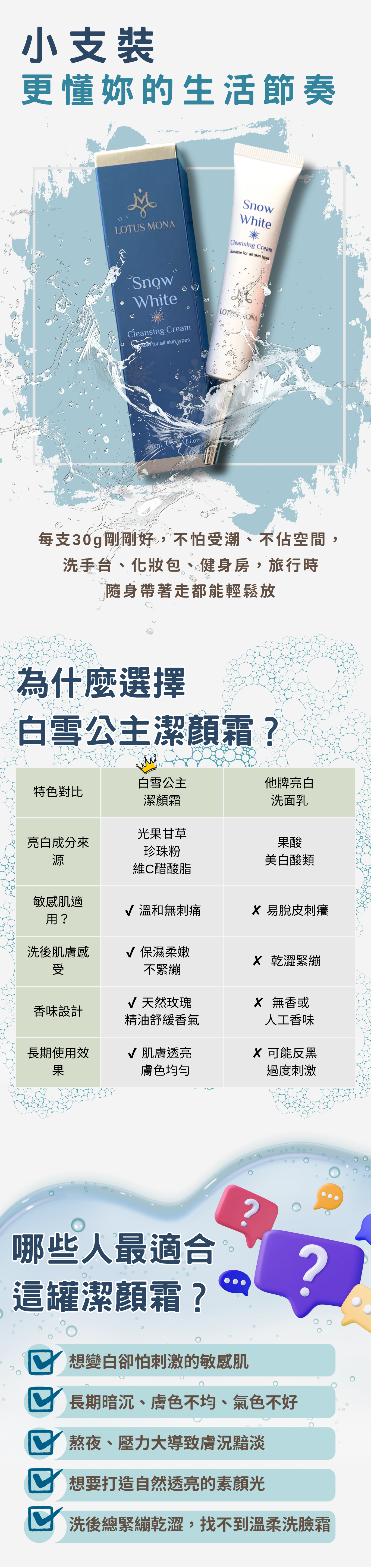第一次接觸「白雪公主潔面乳」是在活動講座看到陳總示範,模特兒在使用後的臉立馬亮一階,對它很感興趣! 「白雪公主潔面乳」洗完後皮膚變得很乾淨,不會乾澀,皮膚可以深層呼吸! 它30g輕巧包裝適合在外出旅行,我即將要出國去日本旅遊,一定帶上它跟我一起出發!